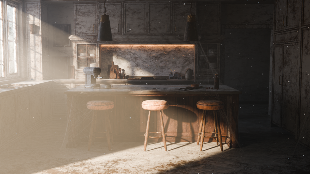The procedural material manipulation effects can impact your Blender viewport and render performance. This also applies to other possible atmospheric details, like fog, cobwebs, or dust particles. Too many cobwebs can have a heavy impact on the overall polycount.